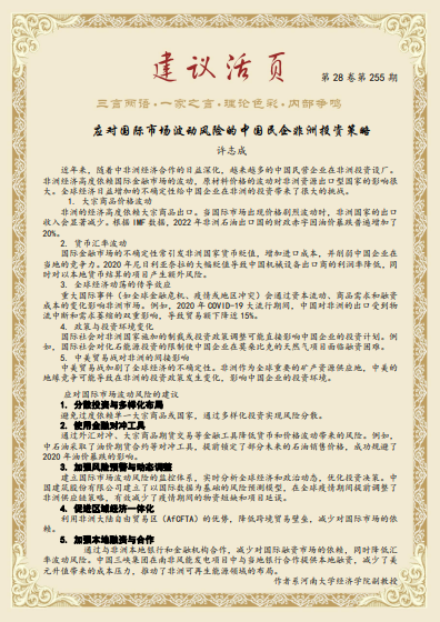 近年来,随着中非洲经济合作的日益深化,越来越多的中国民营企业在非洲投资设厂。非洲经济高度依赖国际金融市场的波动,原材料价格的波动对非洲资源出口型国家的影响很大。